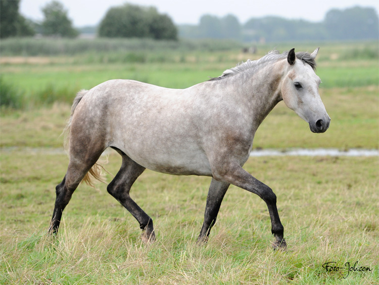 Selbst gezogen ist er das dritte Fohlen gleicher Anpaarung, die Vollgeschwister können besichtigt werden. Auf guten Wiesen groß geworden hat er inzwischen ein Stockmaß von 153 cm erreicht.